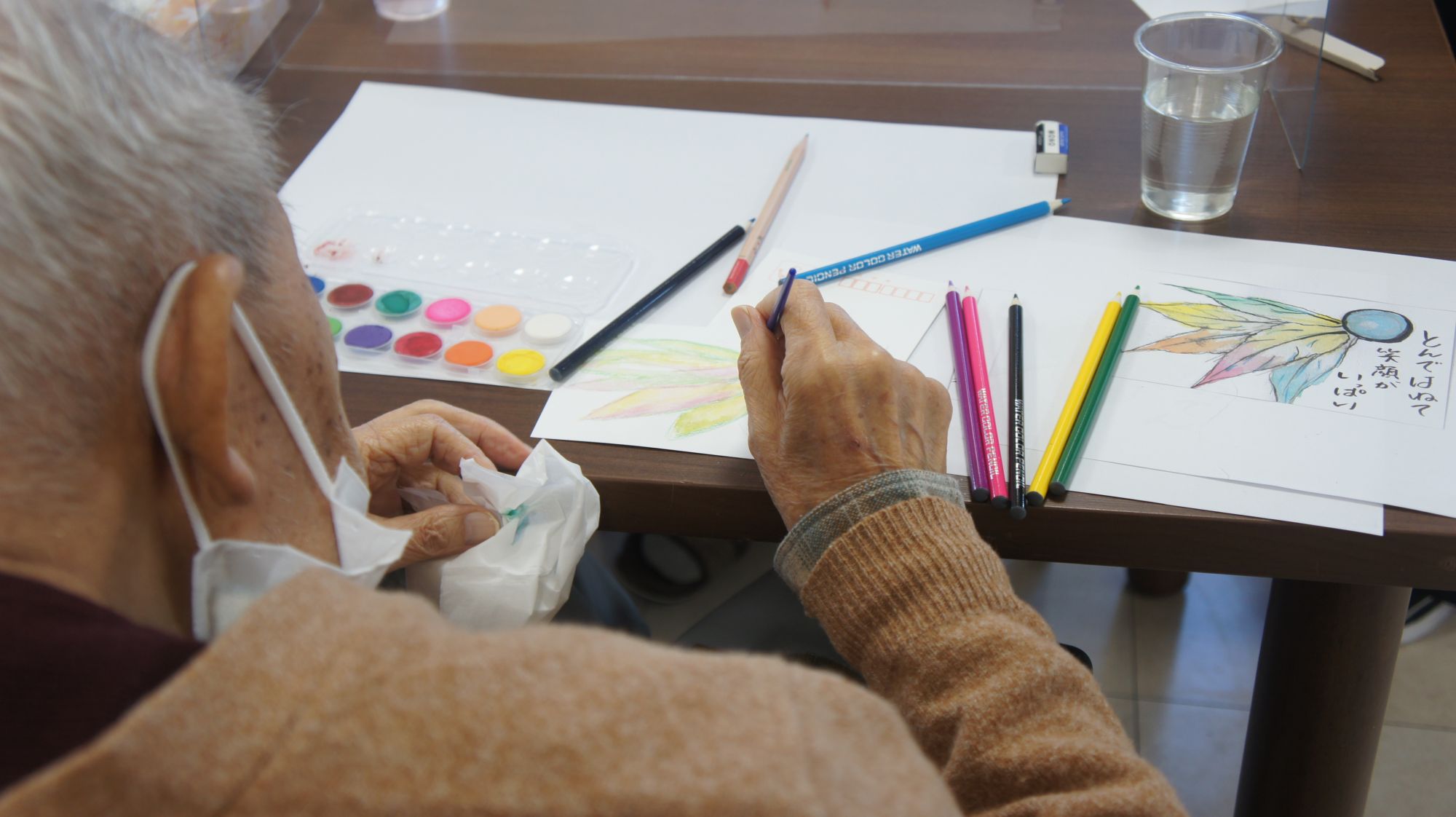 一般的な絵手紙だと、顔彩という塗料を使って描かれるそうですが、イルミーナやまとの絵手紙イベントでは、固形絵の具や水彩色鉛筆(色鉛筆で塗ったところを水筆でなぞると水彩画タッチに変化する色鉛筆)、クレヨンなどをご用意。