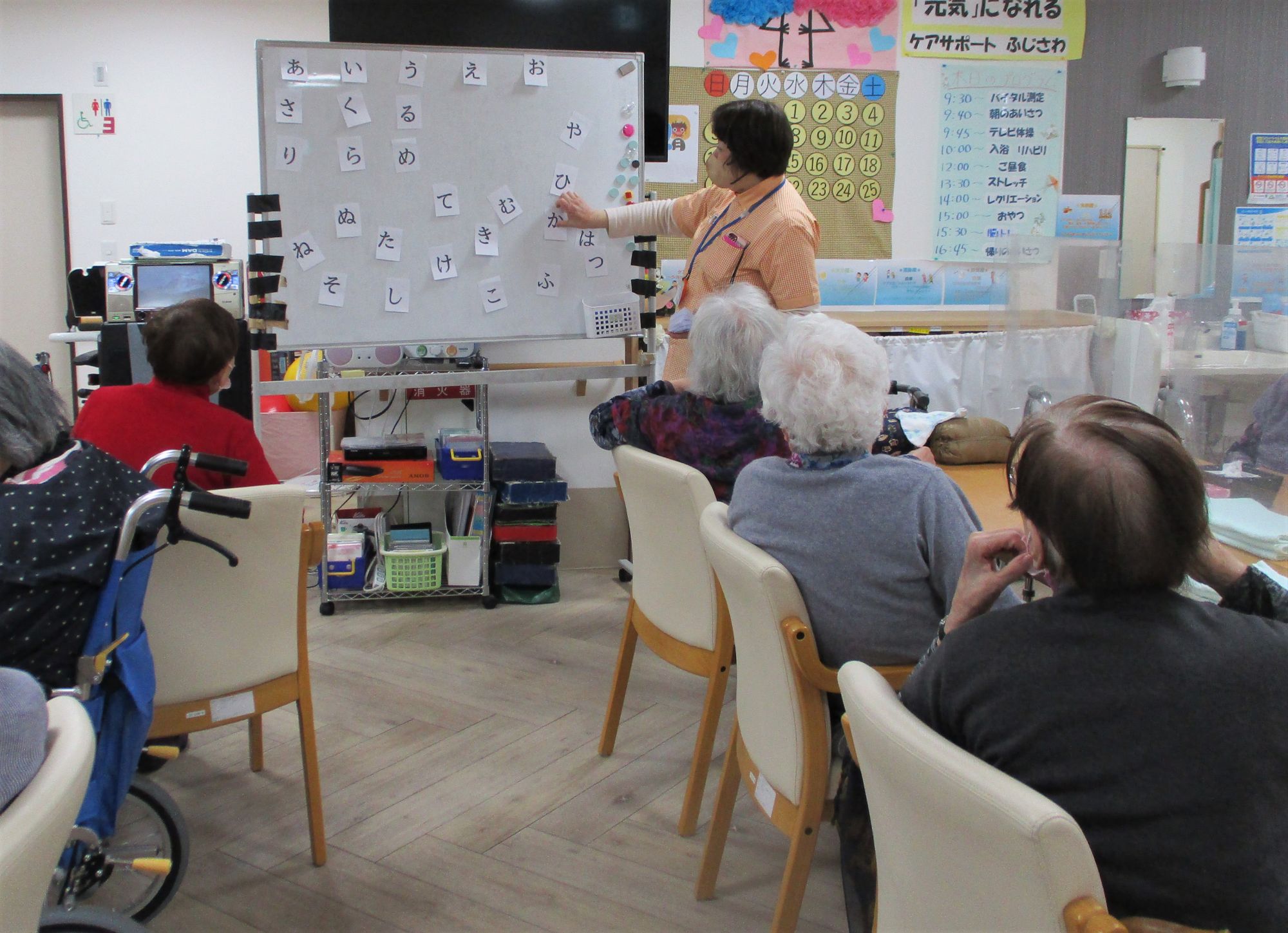 しりとりやクイズなどの脳トレや歌に合わせて手指の体操をしたり・・・