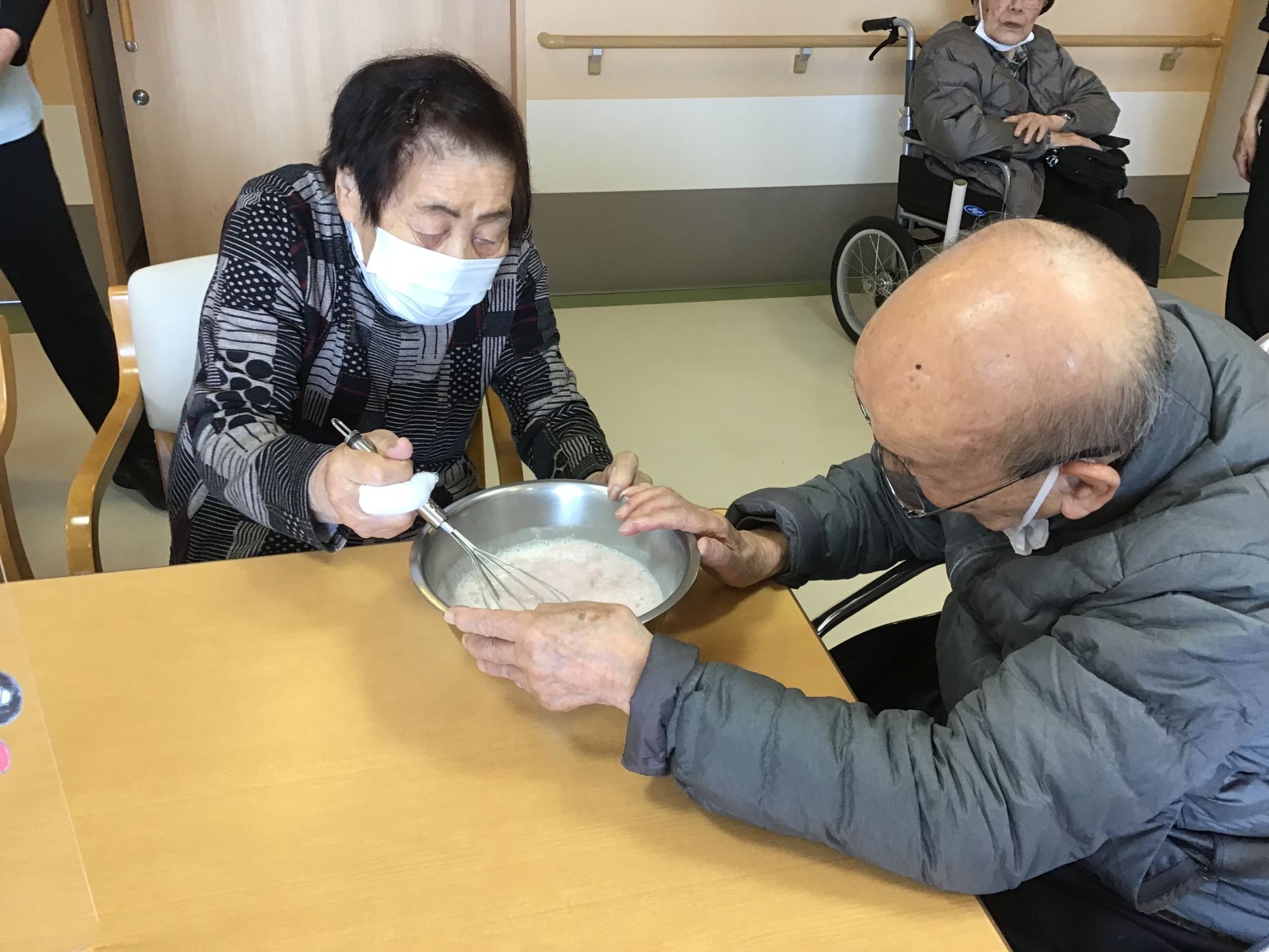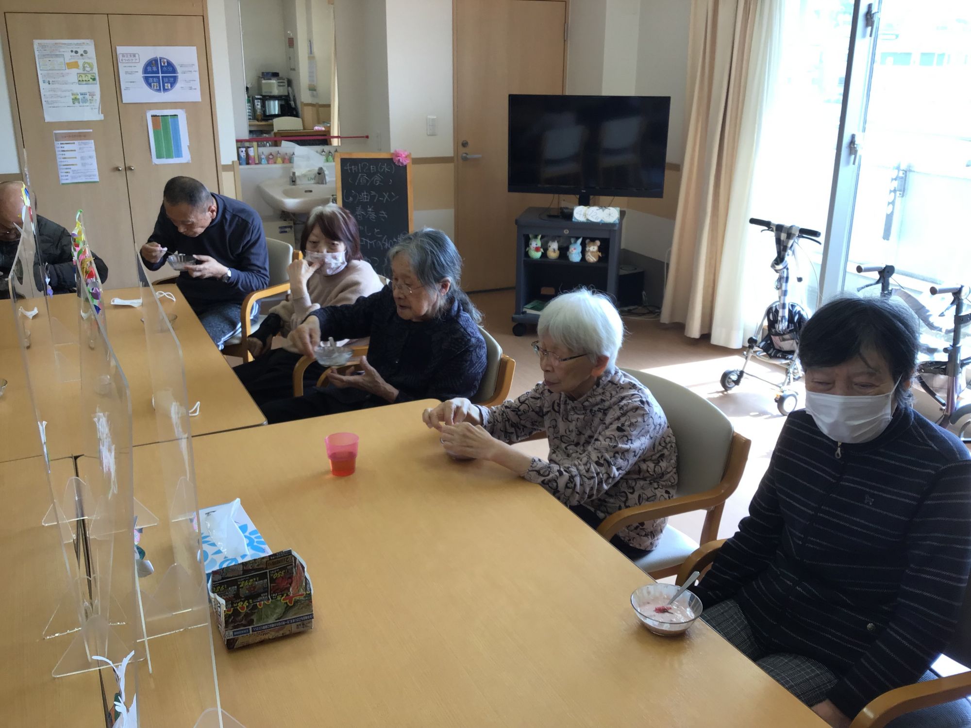 今月の食レクは、フルーチェを作りました、桜の花の塩漬けをのせて季節を感じていただきました♪