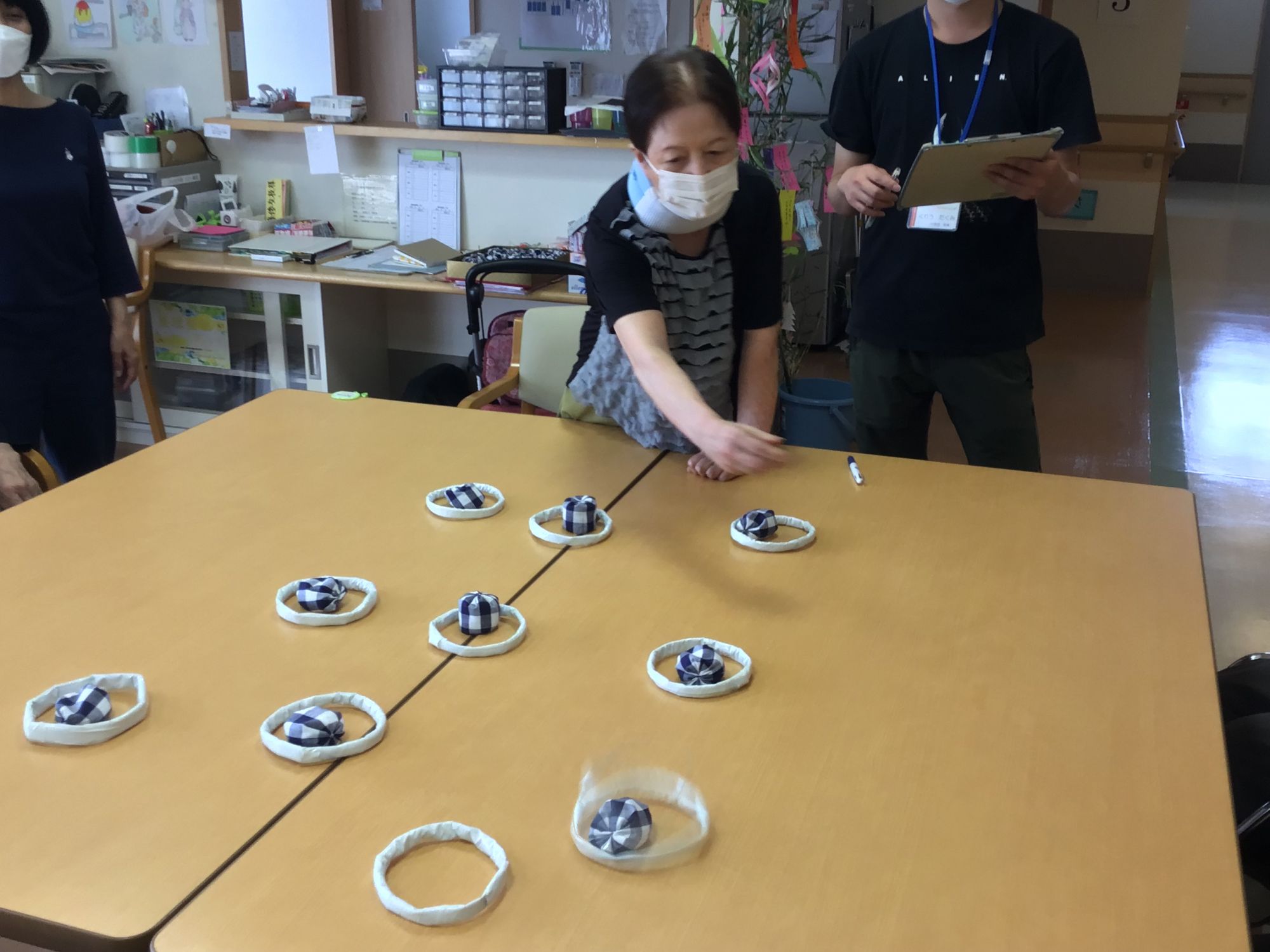 お手玉に輪っかが一列に並べばビンゴです、みなさま狙いをさだめて投げております!!