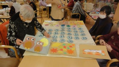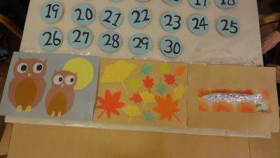 秋の「紅葉」と「サンマ」と「フクロウ」を貼ってもらいました。