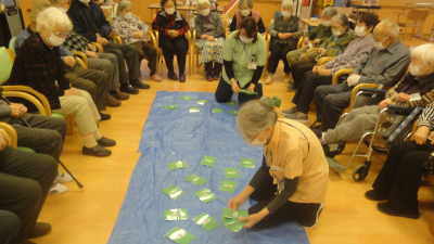 その後にチームに分かれて百人一首の「坊主めくり」を、手のひらサイズの絵柄カードを作ってあそびました。
