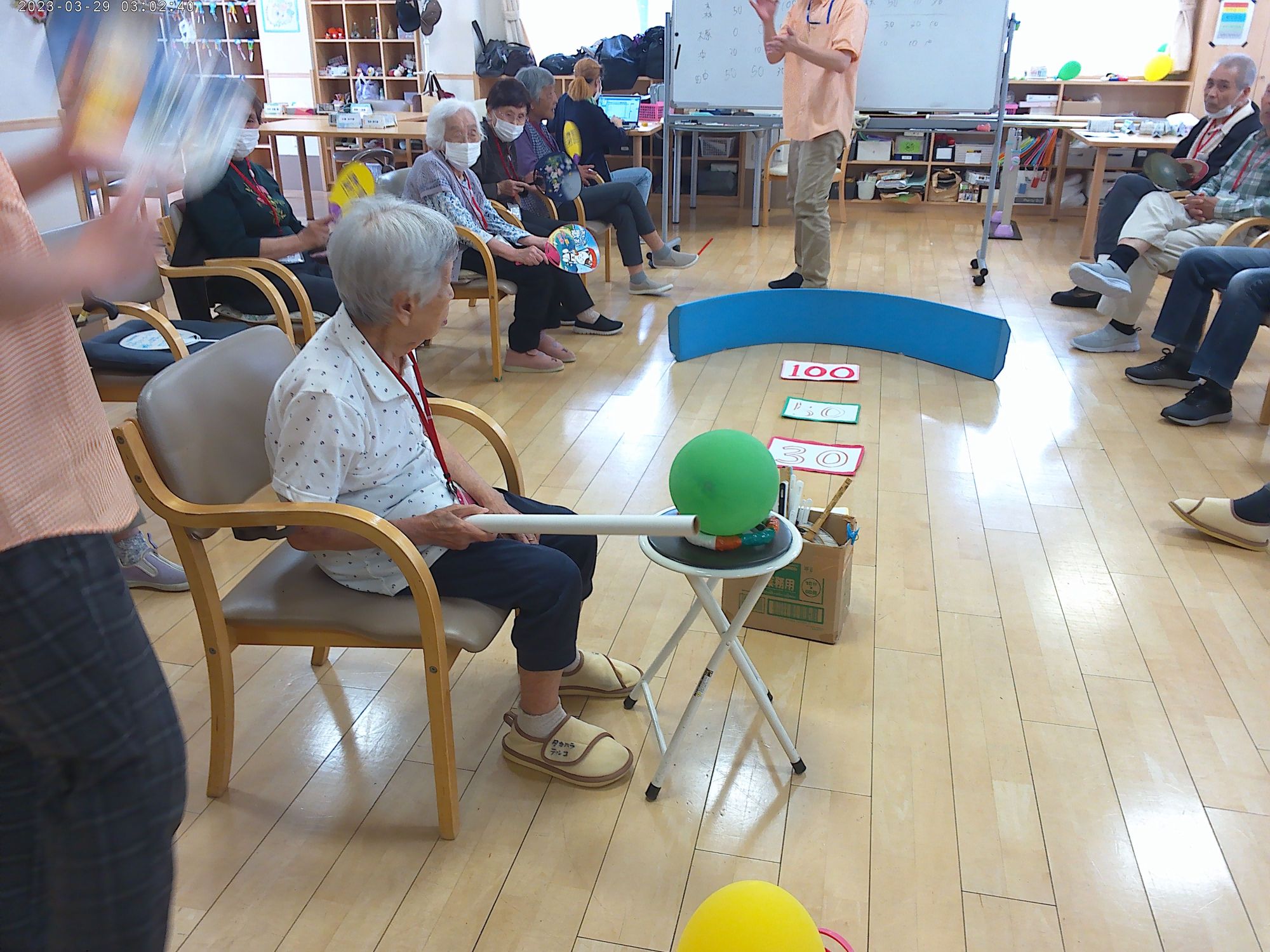 点数の書いてある的に狙いを定めて、風船をバットで打ってもらい当たった合計得点で勝者を決めるという、今の時期にピッタリのゲームを行いました。