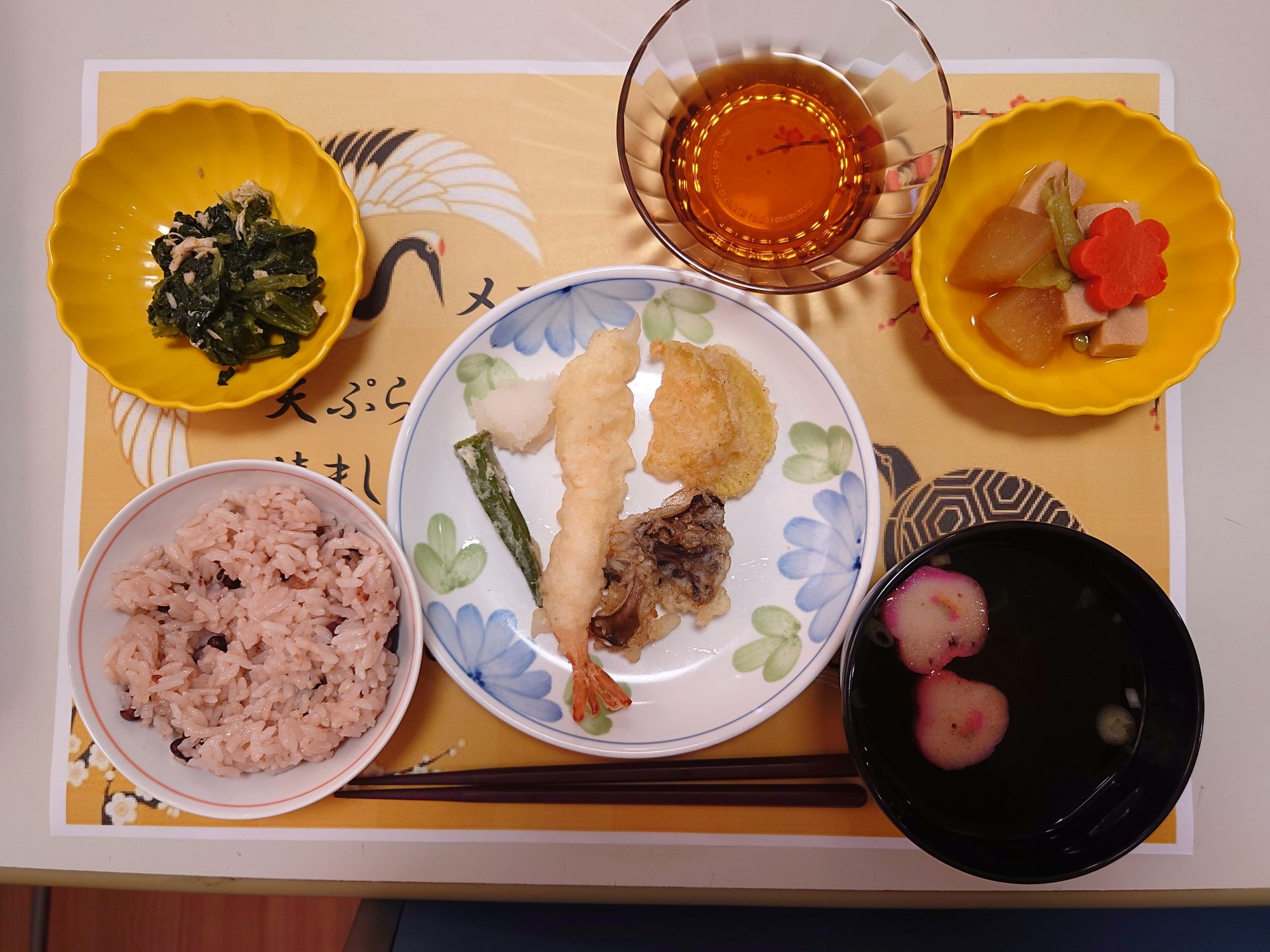 お昼ご飯はイベントメニューで【天ぷらの盛り合わせ・高野豆腐の煮物・ささみとほうれん草の和え物・お赤飯・清まし汁】です。皆様「天ぷらがサクサクですごく美味しかった!」や「お赤飯久しぶりに食べた!」などと言っ召し上がっておりました!
