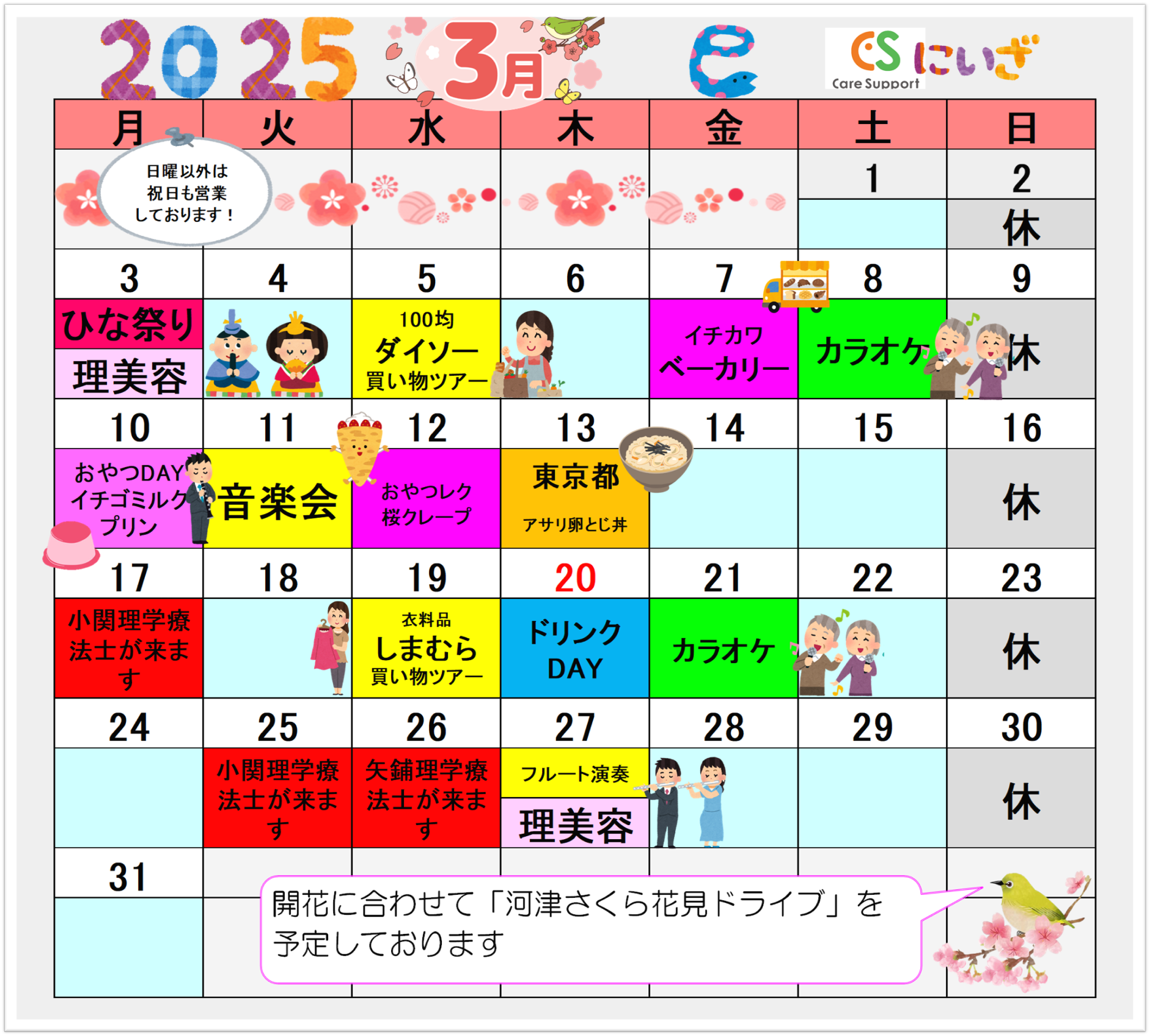 お出かけレクリエーションもあるので(開花に合わせて河津桜を見に行く予定です!)