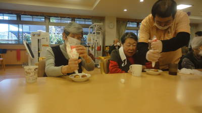 食べる前に「赤鬼」と「おかめ」が出てきてご利用者様が豆まきしていました!