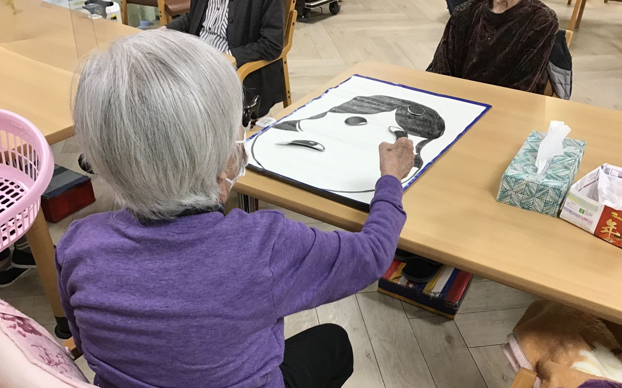 レクリエーションは投げ福笑いです!顔のそれぞれパーツを目隠しではなく投げ落とした場所が作品となります。
